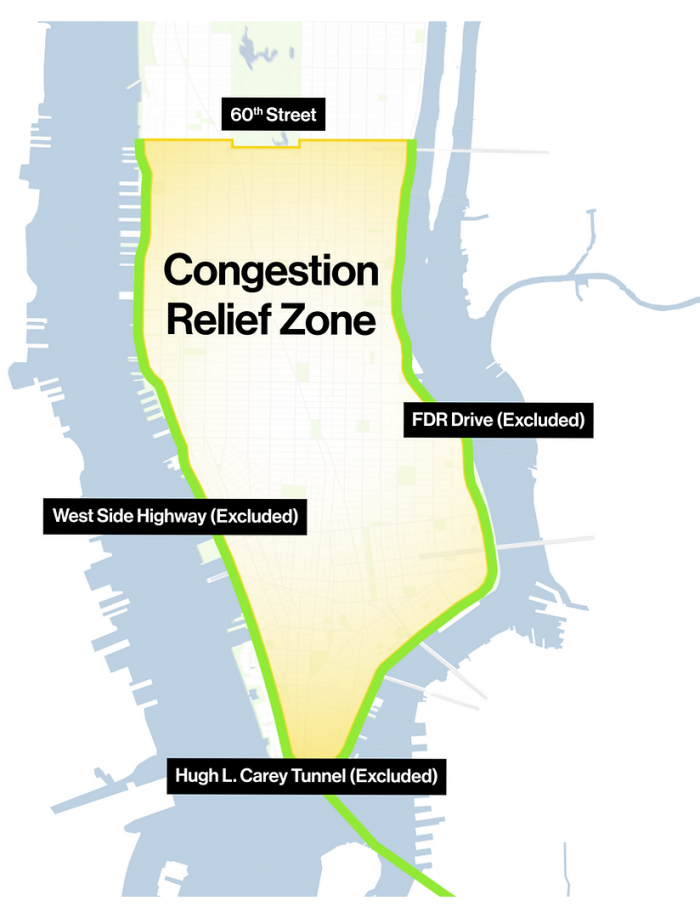 対象の渋滞緩和ゾーン(Congestion Relief Zone)には、マンハッタンの60ストリートの南にあるローカルストリートとアベニューが含まれます。