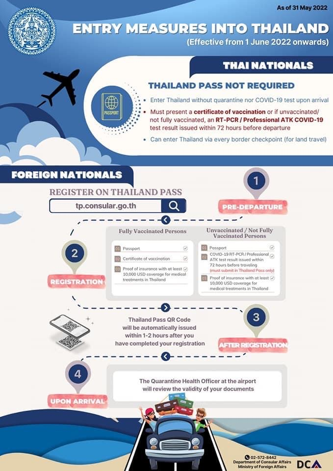 1. 2022年7月1日よりワクチン接種状況によらず、全てのタイ国籍を有しない渡航者に対してタイランドパスの申請が廃止されます。タイ国内で治療費補償がある医療保険の加入に関しては任意となります。