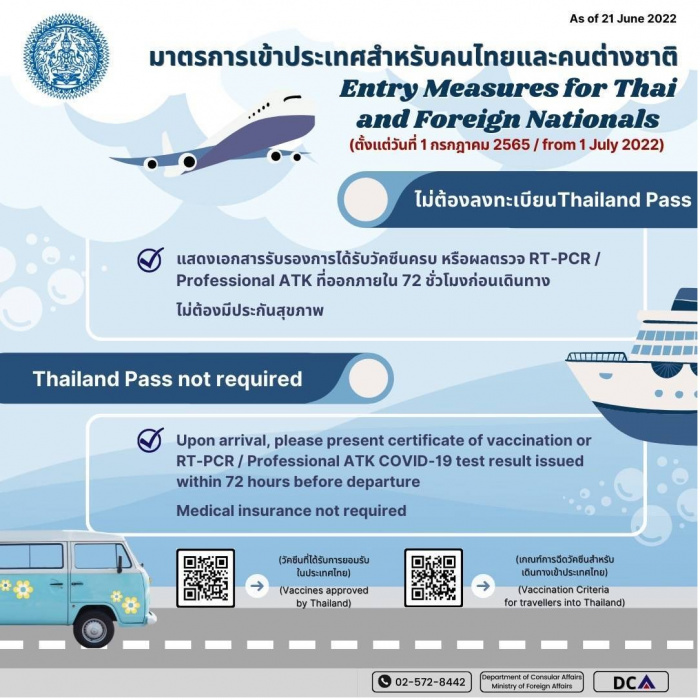 1. 2022年7月1日よりワクチン接種状況によらず、全てのタイ国籍を有しない渡航者に対してタイランドパスの申請が廃止されます。タイ国内で治療費補償がある医療保険の加入に関しては任意となります。