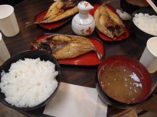 朝市で購入された、鮮魚や干物をその場で調理してくださる、