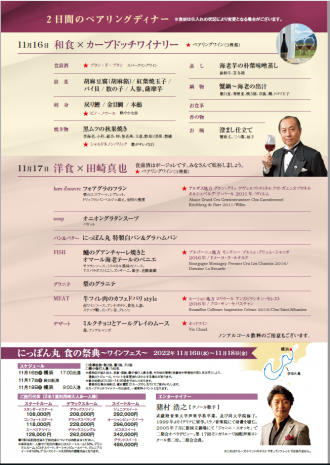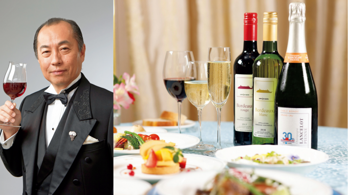 まずはにっぽん丸自慢の2回の夕食をご紹介しましょう。1日目は1992年からワイン造りに挑戦した新潟のワインコーストにある「カーブドッチワイナリー」の提供する3種類のワインと和食のペアリング。2日目の夕食は、ボージョレ・ヌーボーで乾杯、その後フランス料理とソムリエ田崎真也が選んだ3種類のワインのペアリングをお楽しみください。