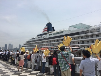 7月8日(金)、飛鳥Ⅱは日本一周グランドクルーズ33日間の航海を終え、晴海埠頭(東京)に帰船。東京都が集ったボランティアの出迎え隊と某大学の吹奏楽部で、普段は静かな晴海客船ターミナルも賑やかに。笑顔で下船されたお客様から”楽しかったよ””食事が美味しかった”等々の言葉で、我々スタッフもホッとした気持ちになりました。本当にご乗船、有難うございました。そして、その後、事務所へ急いで帰社する途中、有楽町駅前にて、何と!くまもんと遭遇。各地のふるさと納税を紹介した展示会の応援に来ていたようですが、くまもん!頑張れ!と思いながら、写メを一枚、、、。愛くるしいですね。しかし、左隣のゆるきゃらは誰?ごめんなさい、判らない。朝から色々あった1日でした。