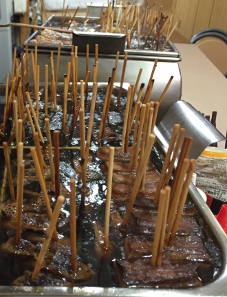 さて、今回、私は新しい訪問スポットとして清水港から車で約25分、JR静岡駅の近くにある“青葉横丁”を取り上げたく思います。左右に20店舗弱が立ち並ぶ横丁に一歩足を踏み入れると、この道、何十年の女将さんから“いらっしゃ~い”の声。何時間も濃い汁に漬け込んだ数々のおでんに目と口が仰天!どんだけ~…。頑張って訪問した甲斐がありました。清水港に寄港したら、是非、静岡おでんも忘れずに。