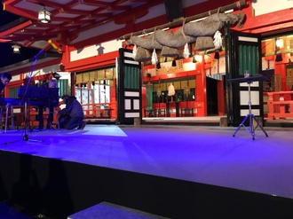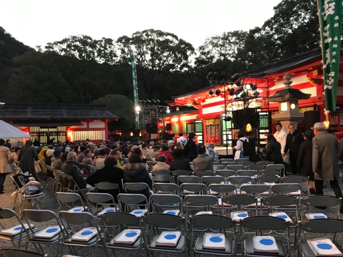 18時を過ぎ、夕暮れの中、全乗船客対象のプレミアム企画(テノール歌手 秋川雅史コンサート)が開催された。秋川様は2011年に熊野那智大社境内で復興祈念コンサートを行っており、それに次ぐ境内のコンサート。気温5度と寒い中、白い息を吐きながら全身全霊で約40分の歌声に身震いを。コンサート前に郡司の講和もあり、この開催のために準備に追われた、新宮市関係者、商船三井客船スタッフの皆様に感謝申し上げます。