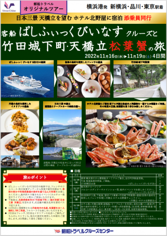郵船トラベルでは横浜港から2泊のクルーズを楽しみ、神戸港下船後は専用バスを利用して本場の松葉ガニを味わえる天橋立の名旅館に宿泊する添乗員付きのオリジナルツアーを企画しました。グルメに名所観光、紅葉も期待できるこの秋一押しの旅をご紹介します。