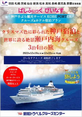 ~さよならの前に~ ぱしふぃっく びいなす、クリスマスクルーズの一部が全国旅行支援の対象となりました。神戸発着の瀬戸内海クルーズを利用した郵船トラベルオリジナルツアーは全国各地より参加可能です!