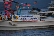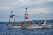 夕方の出港時には、地元の漁船によるお見送りが。大漁旗を掲げた十数隻の船が“ぱしふぃっく びいなす”の周りをパレードして見送ってくれました。