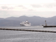 観光を終えて、“ぱしふぃっく びいなす”が待つ港へ。沖合いに見える白い船体がきれいです。こういう風景を見ると、船への愛着がぐっと増してきます。