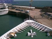 下の写真は、セレニティからシンフォニーを見たところです。白いシンフォニーの船体の左後ろにドーバー名物のホワイト・クリフを見ることができます。 真っ白なクリスタル・シンフォニーの船体はやはり美しいです。