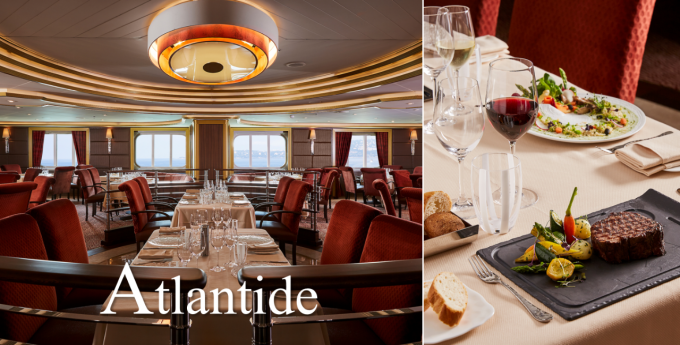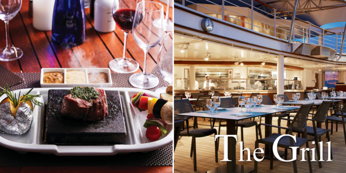 ロイヤルクラブ(タラバガニ)やブルーロブスター(伊勢エビ)など最高級の食材でご提供するシーフードレストラン。もちろん、お肉好きにはブラックアンガス牛のカルパッチョやステーキなどグリル料理もお楽しみいただけます。シルバー・ミューズのメインダイニングに替わるレストランです。インスイートダイニング(お部屋でのサービス)も承ります。