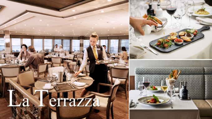 シルバーシーはもともとイタリアのクルーズ会社、シルバーシーダイニングのシンボル的レストランがラ・テラッツァです。ランチタイムはビュッフェでご提供、オリーブオイルセラー、シーフードステーション、サルメリア(生ハム、サラミなど)のイタリア食材が並ぶコーナーのほか、巻きずしなどもを楽しめます。夜ともなれば本格的なイタリア料理店としてアラカルトメニューも充実しています。