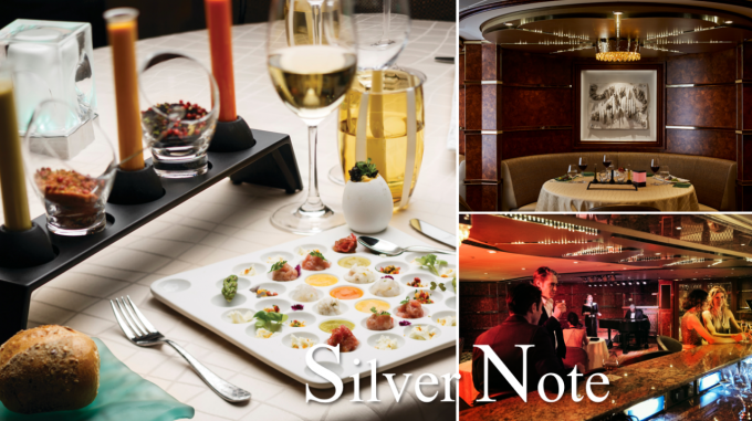 クルーズ船に乗船したら、普段は訪れないお店にでかけるのも楽しみのひとつ。シルバーノートはジャズとブルースのライブ演奏を楽しむ大人のナイトクラブ。奏でられる音楽にあわせてダンスに興じるのも船ならでは。夕食は午後8時から、ランチを食べすぎた日は、各国のタパス(小皿料理)で小腹を満たすのもオツなもの。夕食用のお席は少ないおでお早目のご予約をお願いします。バーだけの利用は予約不要です。