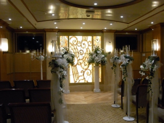 6月といえばジューンブライド。ということで今日は船内のチャペル「Hearts & Minds Wedding Chapel」にご案内します。チャペルがあるのは7デッキ(プロムナード・デッキ)の吹き抜けの近く。