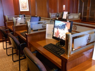 接続は有料で、料金は1分あたり2ドル程度とのこと。クルーズ船はどの船もそうなのですが、インターネットはサテライト通信なので、接続スピードは陸上に比べどうしても遅くなります。こちらのPCは英語入力のみとなります。