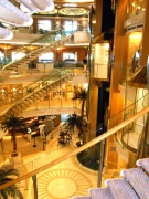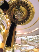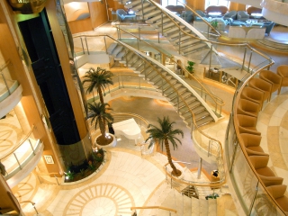 上に目を向けると、4層吹き抜けの明るいホールになっています。7万7千トンクラスの客船では通常吹き抜けは3層までが一般的とのことですが、サン・プリンセスは船内の開放感を演出するため4層の豪華な吹き抜けにしたそうです。
