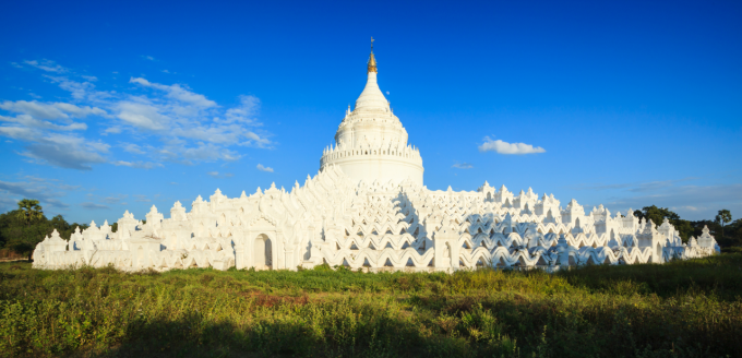 マンダレーの船着場から仏教遺跡がお出迎え。繊細な白い塔が丘の上に並んでいます。このあたりは良質の大理石が産出されることもあり、白く美しい建築物が多いのです。特に有名なのがマンダレーより上流にあるミングォンのシンビューメエ。他界した王妃のために建てられた須弥山に見立てた仏塔です。