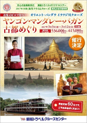 3月3日は人気リバー船でイラワジ川を悠々クルーズしませんか?12月22日までの募集です。