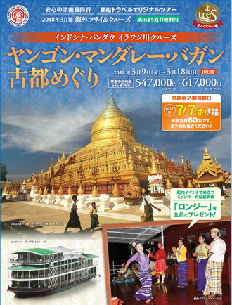 催行決定!3月9日はクラシカルなリバー船でイラワジ川を悠々クルーズしませんか?アッパーデッキは早期代金延長です。