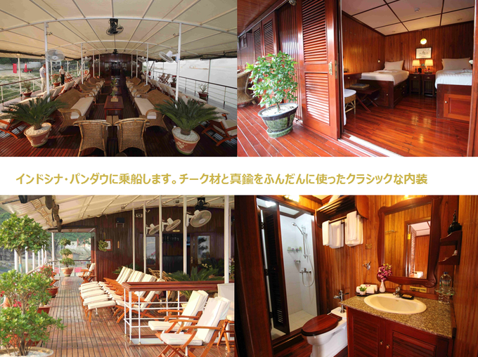 今回ご紹介するのはチーク材をたっぷり使ったコロニアル風のリバークルーズ船、英国統治時代を彷彿とさせるクラシカルなインテリアのインドシナパンダウです。アジアのリバークルーズには定評があり、メコン川にも多くの船が就航していて欧米のお客様には高い評価を得ています。親切で、暖かいサービス、地元の特産品を使い、洗練されたアジア料理は日本のお客様にも毎日食べても飽きないと、好評を博しています。