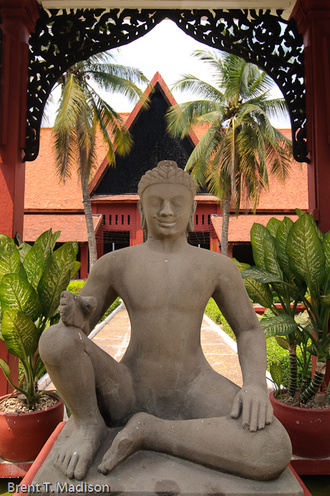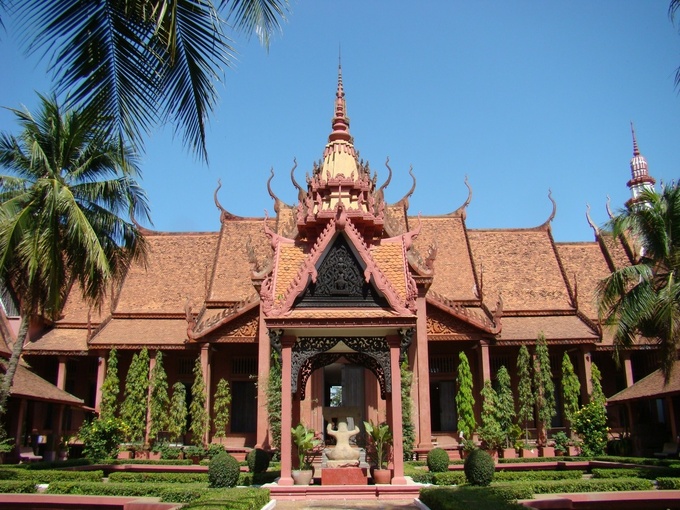 王宮の北側に位置する国立博物館はカンボジア全土から集められた文化財がおさめられ、特にアンコール遺跡群の優れた彫像が鑑賞できるので、アンコール・ワットに訪れる前に是非予習しておきたい場所です。中庭中央に座るジャヤヴァルマン七世像、通称ライ王像は、アンコール遺跡群のバイヨン遺跡から北の王宮があったとされる遺跡周辺、ライ王のテラスにある像です。ライ病にかかった王という説、ひげとキバのある閻魔大王とする説など諸説のある謎の王は、蠱惑的なほほ笑みで私達を魅了します。この他にも8本腕のヴィシュヌ神像、横たわるヴィシュヌ神像は必見。