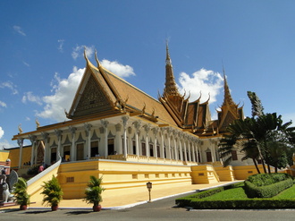 当初木造であった王宮は20世紀初頭、フランス人建築家によって再建されました。カンボジアはタイやラオスと同様に上座仏教の国なのですが、至るところにクメール(ヒンズー教)の影響が見られ、後に訪れるアンコール・ワットのナーガ(ヤマタノオロチのような蛇)やシンハ(獅子)の聖霊獣のモチーフが見られます。隣には5329枚もの銀のタイルを敷き詰めたシルバー・パゴダが隣接し、25カラットを含む2086個のダイヤがちりばめられた黄金の宝冠仏や小さなエメラルドの仏などの宝物が鎮座しています。