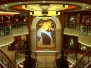 船内に入ると、まず目を引くのが船体中央の螺旋階段に掲げられたクイーン・エリザベスの巨大なウッドパネルです!