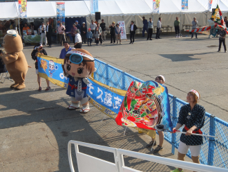 歓迎式典では岩手県 県北広域振興局 八重樫一洋様(やえがし かずひろ)局長にご登壇いただきました。久慈のゆるキャラ「アマリン」もお出迎え。「アマリン」と一緒にお客様を出迎えてくれた海女の装束に身をつつんだ女性は、「あまちゃん」のヒロインと同じく都会から岩手に移り住んだのだそうです。現在は「久慈市地域おこし協力隊」の一員で、伝統文化の保存・海女文化の継承など地域おこし活動に取り組んでいるそうです。