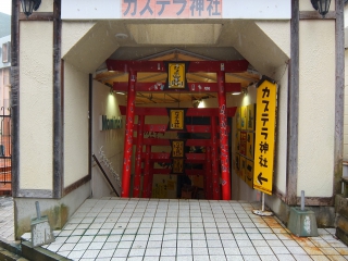 カステラ神社と書かれた赤い鳥居をくぐると、カステラ大明神がお迎え。