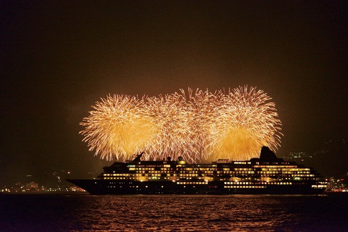 熊野大花火には、クルーズ船も大集合。3隻が寄港して港に華を添えます。