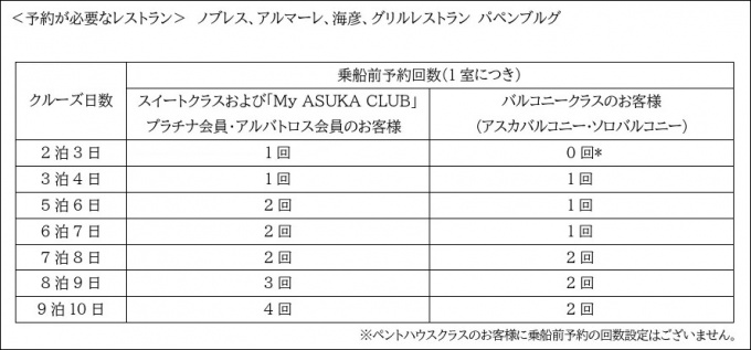 「飛鳥III」2026年1月29日出発の「神戸発着 初春の週末 蒲郡クルーズ」から、予約制レストランの乗船前予約回数について上記の通り回数が制限されることとなりました。