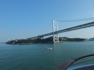 昨日の10月3日は晴天に恵まれたべた凪に瀬戸内海を終日航海というまたとないチャンスとなり、ゆったりと朝食の時間に瀬戸大橋の下をくぐりました。