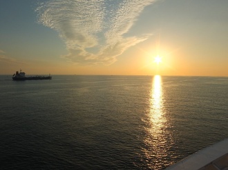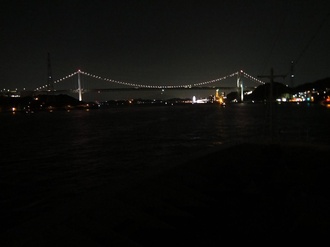 瀬戸内海に落ちる最高の夕日を見た後は、夕食後に関門海峡通過のハイライトも見ることができ、すばらしい終日航海の一日。