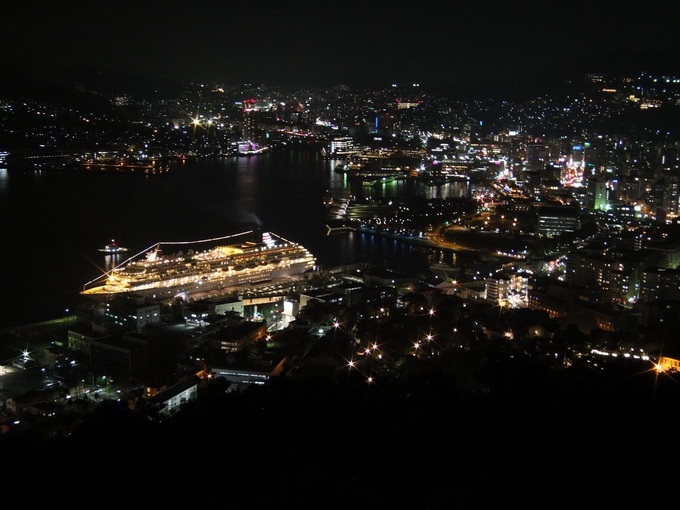 長崎の夜景といえば「稲佐山」が有名ですが、「新世界三大夜景」に選ばれたただけあって平日でもロープウェイが混んでいます。そして「松ケ枝国際客船ターミナル」に停泊中の飛鳥IIからはちょっ遠いのですね。