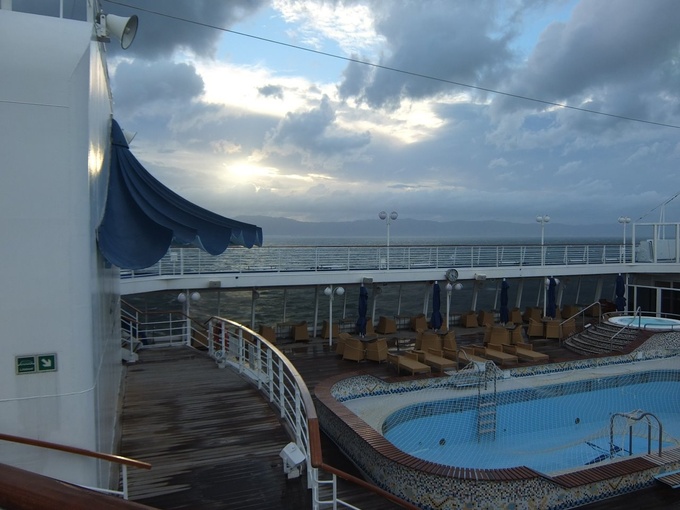 本日10月5日(金曜日)「飛鳥Ⅱで航く秋の瀬戸内海クルーズ」は、鹿児島港入港15:00でおわってしまうはずでした。台風は近づいているけど、かなり離れているし、天気もご覧のとおり「薄日」が差しています。風もそこそこあるなあっと、、、でも「鹿児島港マリンポート」までは少し距離があります。