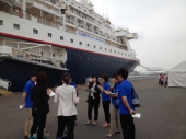 写真は名古屋港に接岸するにっぽん丸と打ち合わせ中の弊社スタッフです。