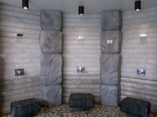 こちらは前回ご紹介した檜風呂と対になっている岩風呂の中にある打たせ湯です。もちろん、こちらの岩風呂にも檜風呂と同様に、海を臨む大きな浴槽とサウナもあります。