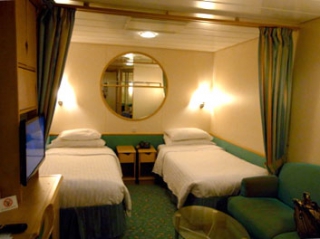 初日から飛ばすと後が大変なので、この日はパレードを見た後はお部屋へ。私たちのお部屋は6階の内側スタンダード(14平方メートル)です。内側のお部屋なので窓はありませんが、船の丸窓をイメージした丸い鏡が飾られています。