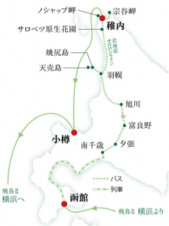 【スケジュール】 7/23 横浜港 飛鳥2乗船 7/24 クルージング 7/25 函館港下船=    函館駅ー(特急北斗)−南千歳駅=    夕張= 富良野(泊) 7/26 富良野=ファーム富田=旭川=羽幌(泊) 7/27 羽幌〜焼尻島〜天売島〜羽幌(泊) 7/28 羽幌=サロベツ湿原=    宗谷岬=稚内・飛鳥2乗船