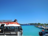 途中の寄港地では、通船での上陸となるのですが、写真はボラボラ島の桟橋でのものです。手前がテンダーボート、その向こうにポール・ゴーギャン号。