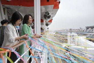3月20日(月)横浜港出港の際は、桜色のロゼワインや色とりどりの紙テープを利用した“桜Style 出港セレモニー”も予定しています。このセレモニーは船上のお客様だけではなく、岸壁にいる方も一緒に楽しむことのできるセレモニーとなっています。