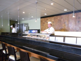 寿司バー「海彦」では、板前さんが仕込みの真っ最中でした。こちらではお寿司、お刺身、小料理のほか、この時期は鍋料理もいただけるそうです(有料)。