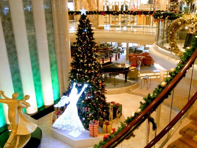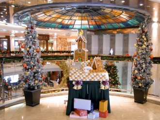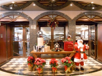 さてさて、午前9時に【HOT LATIN Xmasクルーズ】から帰航した飛鳥II船内です。吹き抜けのアスカプラザは大きなツリーとともにクリスマスクルーズのデコレーションに輝いていました。