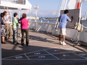 船内を散策していて珍しいスポーツに遭遇しました。シャッフルボード(Shuffle Board)というクルーズ船ではポピュラーなスポーツです。船のデッキプラン(船内図)を見ていると、よくこのシャッフルボードのコートの位置が記されていたりします。シャッフルボード13世紀の英国に起源を持ち、19世紀に船の甲板上のスポーツとして広まったそうです。