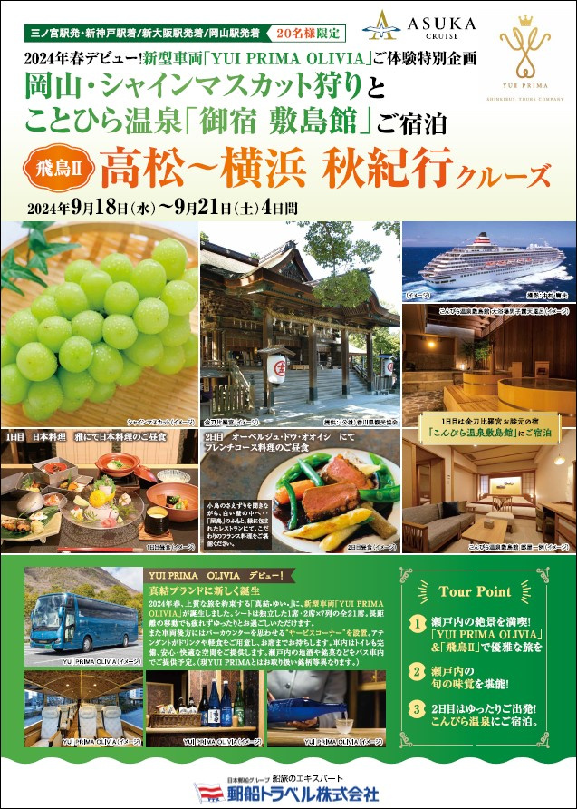 2024年春デビュー!新型車両「YUI PRIMA OLIVIA」ご体験特別企画 岡山・シャインマスカット狩りとことひら温泉「御宿 敷島館」ご宿泊 飛鳥Ⅱ 高松~横浜秋紀行クルーズ<2024年9月18日出発>