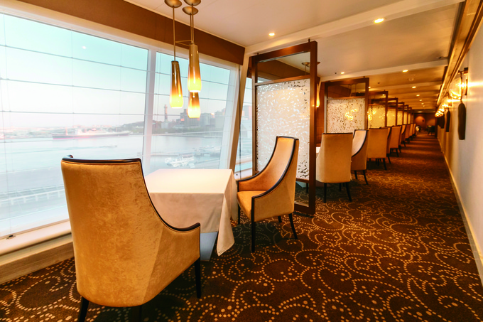 Sロイヤルスイート、Aアスカスイートのお客様専用ダイニングプレゴが「ザ・ベール」へ、名称も変わりました)海に面した2名席が素敵ですね!