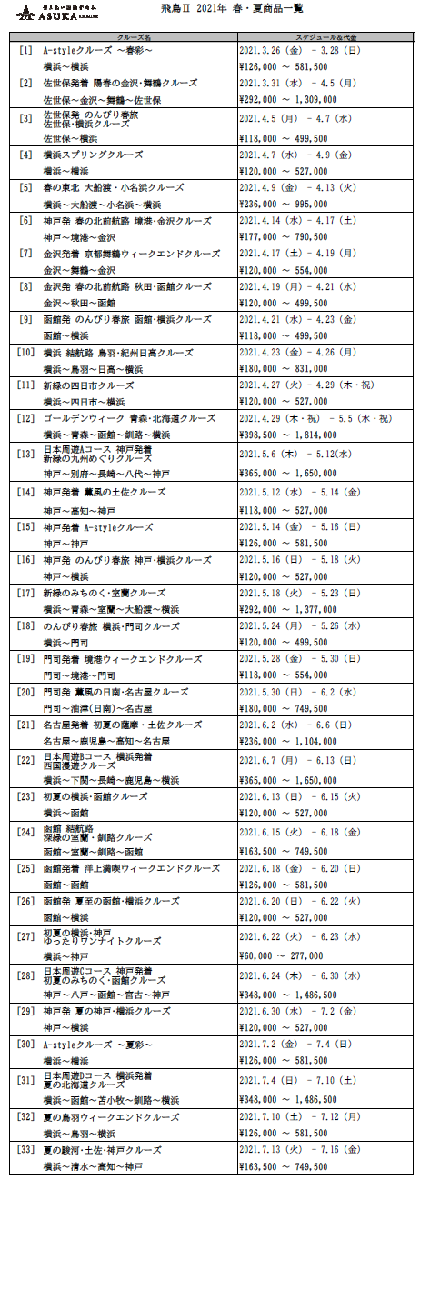 2020年12月22日 飛鳥Ⅱ 2021年3~7月クルーズ発表⛴..。o♬*゚ 金沢発着や、北海道へのクルーズ、そしてKステートの販売が復活します(୨୧ ❛ᴗ❛)✧ ワンナイトから7日間まで33クルーズの発表です!! ✿ 発売開始日2021年1月26日(火)✿ パンフレット請求予約、事前乗船受付中です。お気軽にお問い合わせください! 各クルーズセンターまでお気軽にお問い合わせください☎ ■東 京 03-5213-9987 ■名古屋 052-561-1354 ■神 戸 078-251-6218 ■福 岡 092-475-0011 #郵船トラベル #世界一周クルーズ #飛鳥II 横浜の夜景と飛鳥Ⅱ☆彡 【飛鳥Ⅱ】2021年世界一周... 年末年始 営業時間につい... 一覧 エントリーリスト 2025年11月06日 発表!三井オーシャンサクラ デビュー 2025年10月27日 飛鳥Ⅲ in 函館 2025年09月01日 2026年1月より飛鳥IIIのレストラン事前予約の回数に制限が設定されます 2025年08月29日 【飛鳥III】2026年1月~5月クルーズ 販売開始日が9/17(水)に決定! 2025年08月28日 博多発着の飛鳥II おすすめです 2025年08月19日 三井オーシャンサクラ で決定! カテゴリーリスト ねずみ君のつぶやき♪416 飛鳥II378 世界一周クルーズ9 飛鳥II 2018年世界一周クルーズ1 にっぽん丸219 初夏の日本一周23 コースご案内7 ぱしふぃっく びいなす128 ぱしふぃっくびいなすチャーター16 プリンセス・クルーズ110 現地情報74 クリスタル・クルーズ65 お知らせ59 おすすめ情報53 飛鳥Ⅲ45 キュナード41 添乗レポート40 日本のいいとこ33 ロイヤル・カリビアン・クルーズ30 海外クルーズプランナーのつぶやき25 横浜通信23 港の風景19 MITSUI OCEAN FUJI14 クルーズ関連番組13 神戸通信10 名古屋通信9 ニュースリリース8 ふじ丸6 ディズニークルーズ6 オーシャニア・クルーズ6 冒険クルーズ6 還暦ピアニストのひとりごと6 ごんた君の遠吠え5 ゴールデンウィーク5 お土産4 ホーランドアメリカ4 説明会4 MITSUI OCEAN CRUISES4 バイキング・クルーズ3 シルバーシー・クルーズ2 リバークルーズ2 海の街を歩く2 ノルウェージャン・クルーズ2 コスタ・クルーズ1 セレブリティ・クルーズ1 スーパースターヴァーゴ1 ポール・ゴーギャン・クルーズ1 チャータークルーズ1 寄港地での過ごし方1 シーボーン・クルーズ1 ガンツウ1 ニューイヤークルーズ1 タグ 飛鳥II にっぽん丸 2022年 ぱしふぃっく びいなす 添乗レポート 世界一周クルーズ 飛鳥Ⅱ 2021年 クイーン・エリザベス 2018年世界一周クルーズ 世界一周 ぱしふぃっく びいなす 横浜発着 2023年 マジェスティック・プリンセス ねずみ君 クリスタルクルーズ 大さん橋 耳より 小笠原 #飛鳥Ⅱ 花火 ぱしふぃっくびいなす 瀬戸内海 MITSUI OCEAN CRUISES ダイヤモンド・プリンセス 神戸発着 夏祭り 2024年