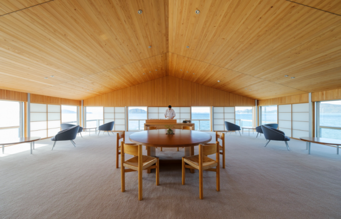 船のデザインを手掛けたのは建築家 堀部安嗣氏。コンセプトは「せとうち、漂泊」。キーワードは「ちょうど良い加減の、おもてなし」。堀部氏によると、瀬戸内海は海面がシルバーに輝くような色合いになることがよくあり、景色に溶けるようにシルバーの外装を選択したそうです。また、瀬戸内海の町の風景にも合うように、日本的な切妻屋根。内装には防火処理したアルダーという木材をふんだんに使い、場所によっては壁に漆喰も塗られています。