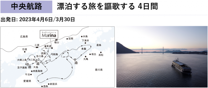広島県の尾道から山口県の上関まで、原風景の残るせとうちの西側を堪能する4日間です。本航路では、尾道水道や音戸の瀬戸をはじめとする、島と島の間を流れる狭い水道をいくつも通りぬけます。古き良きせとうちを探訪する航路です。