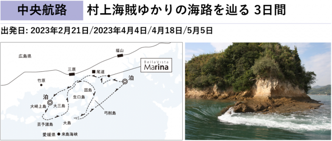 海賊と言うと、商船を襲い、金品を略奪する恐ろしいイメージがあるかもしれませんが、村上海賊(水軍)は一線を画し、難所の多い瀬戸内海の航海の安全と交易や流通の秩序を通航料を徴収することにより守った一族で、主に16世紀に活躍していました。本航路では村上海賊にまつわる海域を周遊し、瀬戸内海を舞台に繰り広げられた彼らの足跡をたどります。