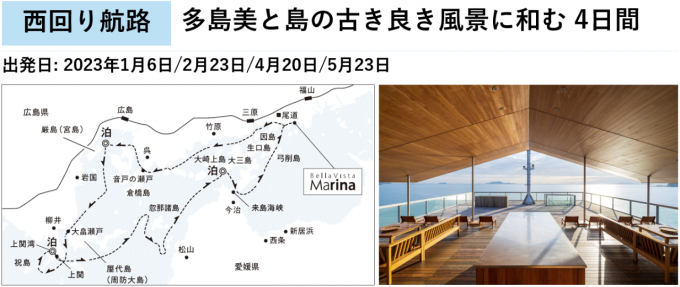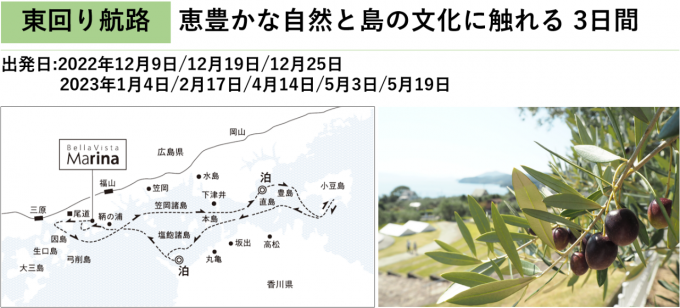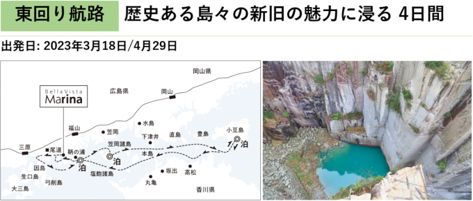 尾道から瀬戸大橋を通航し、玉野沖で錨泊します。翌日は直島諸島 、 水島諸島 、 笠岡諸島 、 小豆島 、 塩飽諸島 などの多数の島々を有する備讃諸島の景観を堪能します。船外体験では小豆島伝統の食文化に触れることができます。